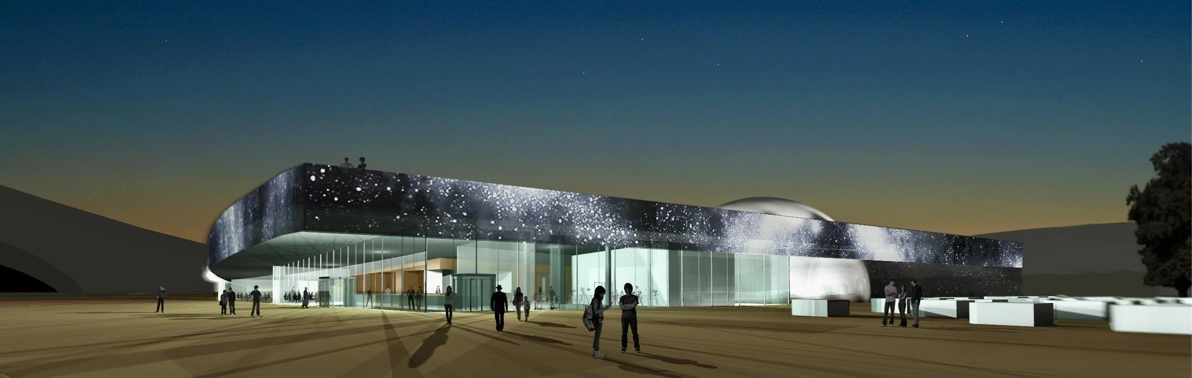 The roof draws the site of the Planetarium. The large overhangs create generous protected intermediate spaces and, at the same time, invite visitors to access the museum.